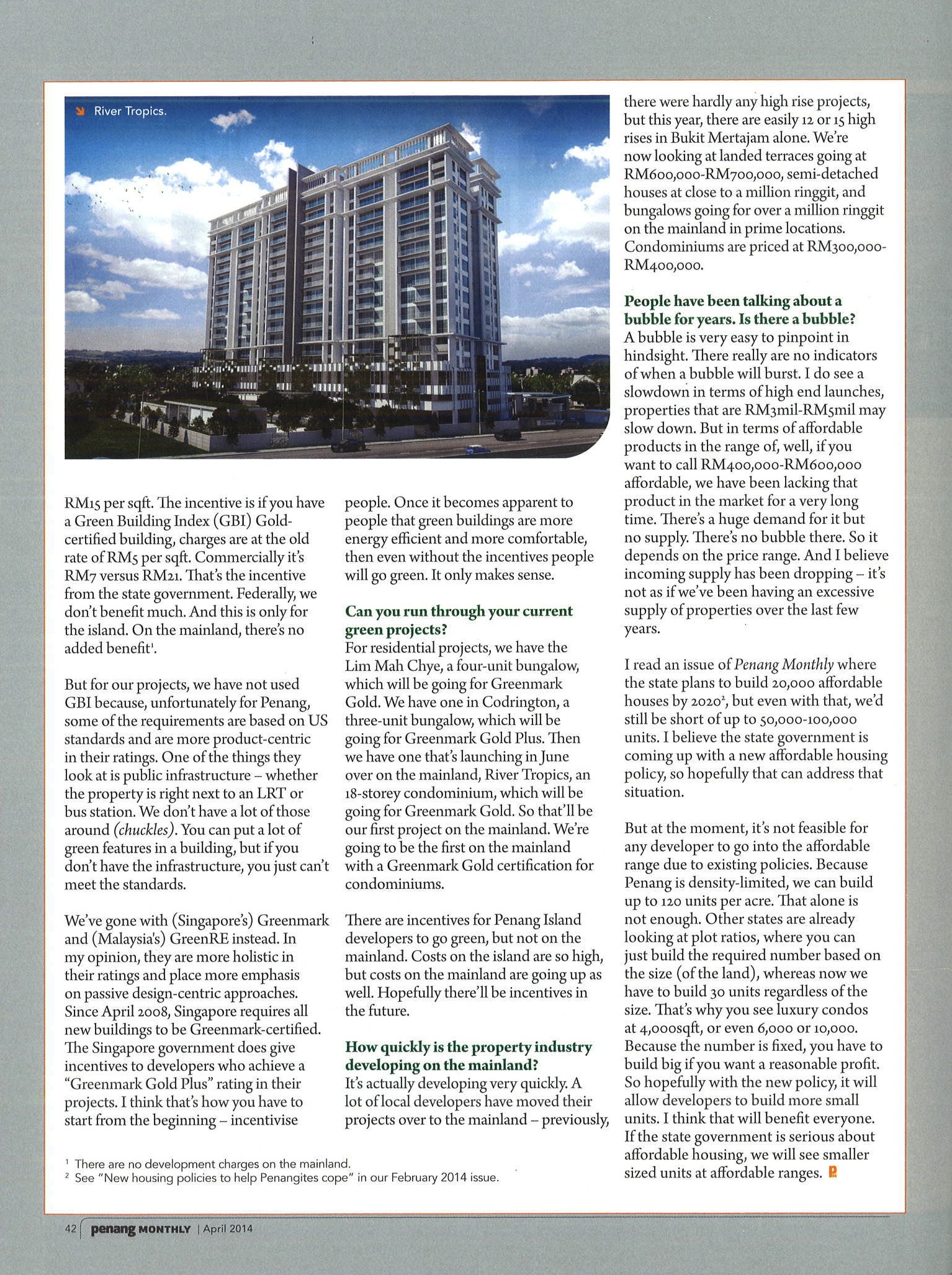 Not enough. Development charges are RM15 per sqft. The incentive is if you have a Green Building Index (GBI) Goldcertified building, charges are at the old rate of RM5 per sqft. Commercially it’s RM7 versus RM21. That’s the incentive from the state government. Federally, we don’t benefit much. And this is only for the island. On the mainland, there’s no added benefit [1].